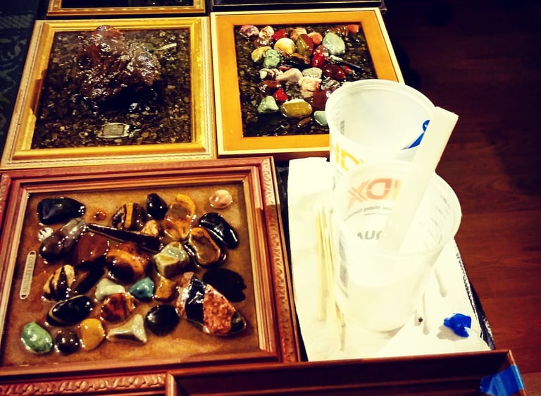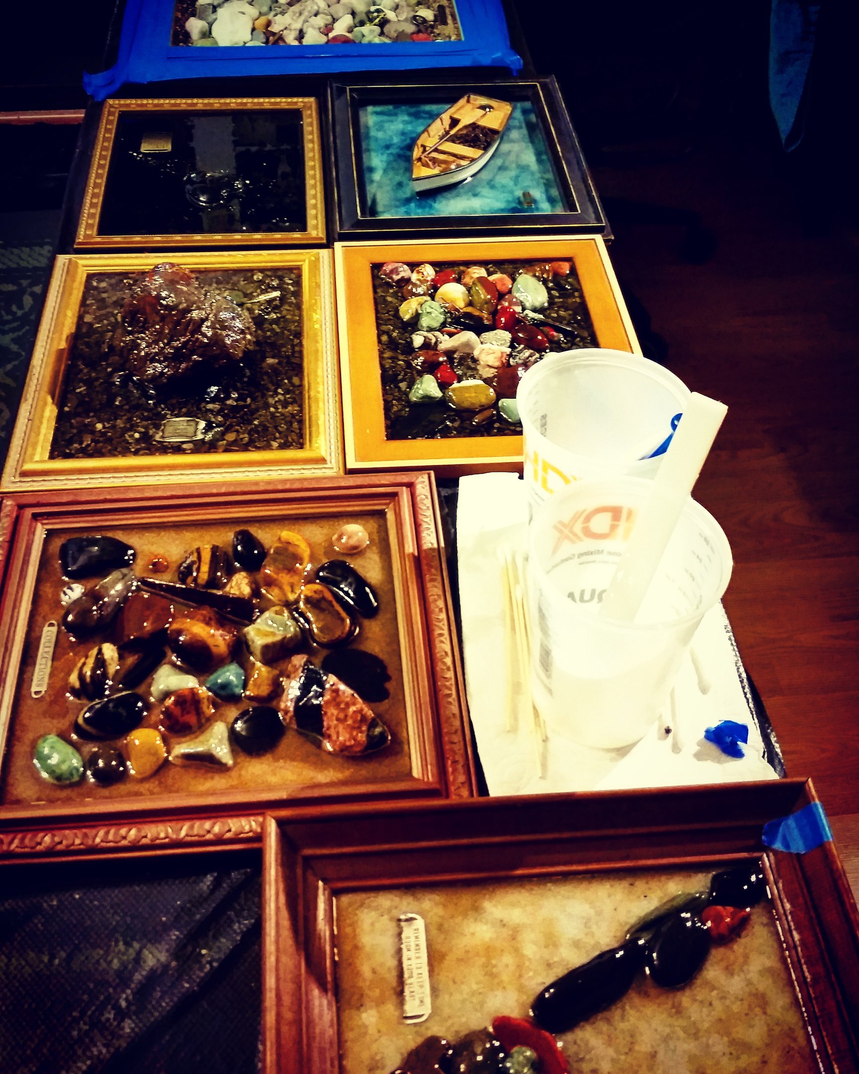 Learn the art of resin work from someone who has over 30 years experience working with resin. From selecting your frame or mold, to minimizing imperfections, adding ripples or applying mounting hardware to hang your piece, studio lessons will reveal all! Plus, with one on one classes, you and your art will get all of the attention! What are you waiting for? E-mail us to schedule your resin lesson!